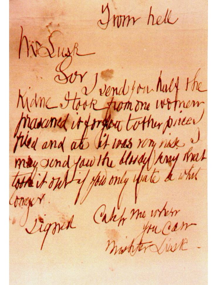 The “From Hell” letter, received by George Lusk of the Whitechapel Vigilance Committee on 16 October 1888 (Image Credit: Public Domain).