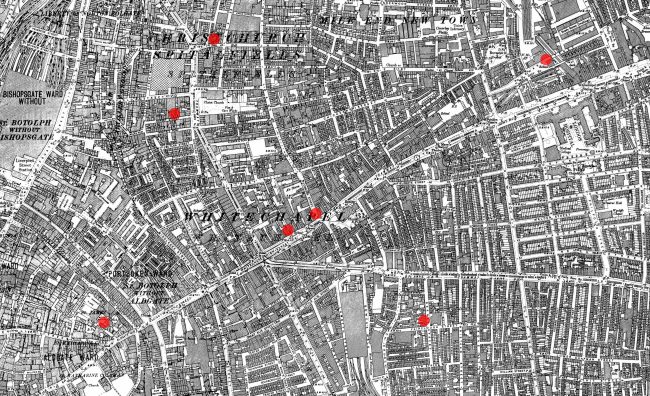 The sites of the first seven Whitechapel murders – Osborn Street (centre right), George Yard (centre left), Hanbury Street (top), Buck’s Row (far right), Berner Street (bottom right), Mitre Square (bottom left), and Dorset Street (middle left).