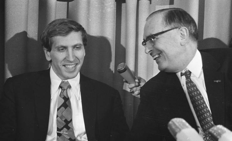 Bobby Fischer (left) at a press conference in Amsterdam with FIDE president Max Euwe, January 1972. Fischer made headlines around the world when he defeated Boris Spassky at the World Chess Championship later that year