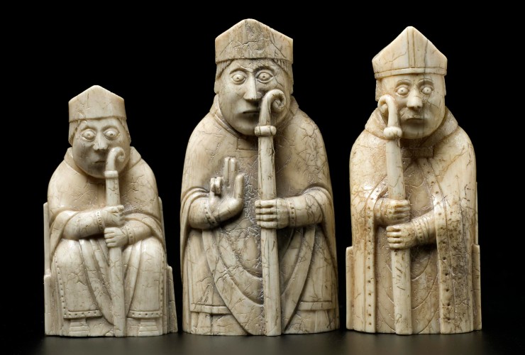 Pieces from a chess set known as the Lewis Chessmen, which were discovered in the Outer Hebrides in 1831. Thought to have been carved in Norway around the 12th century, the existence of the pieces suggests chess may have been brought to the British Isles by the Vikings