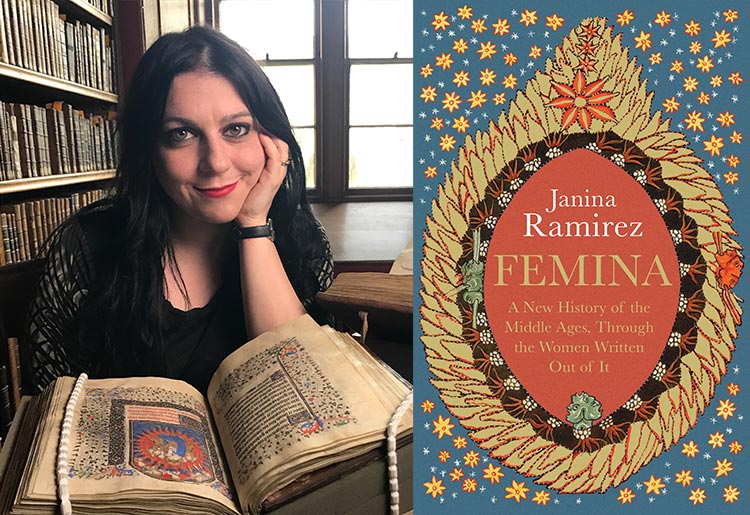 Dr Janina Ramirez (left); Cover of ‘Femina: A New History of the Middle Ages, Through the Women Written Out of It’ (right)
