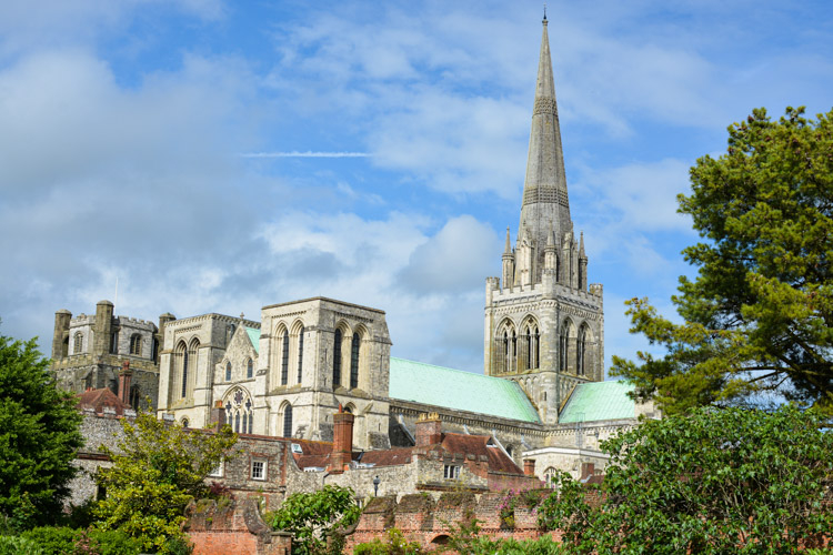 The cathedral is located at the centre of the historic city of Chichester, beside the medieval town of Cross and close to the Novium Museum. Its spire is visible from the Trundle hillfort to the north, and it is the only medieval English cathedral which can be seen from the sea.