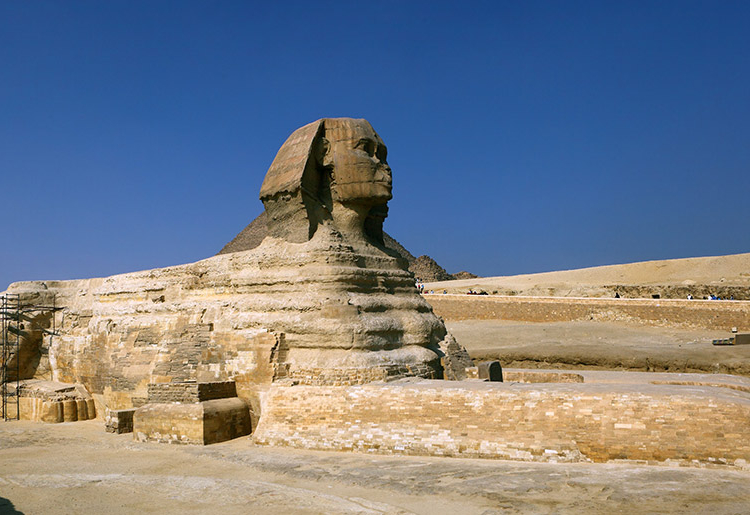The Great Sphinx of Giza is one of the most recognisable relics of ancient Egypt. One of the world’s largest monuments at 20 metres high and 73 metres long, it is a staggering 4,500 years old, since historians generally agree that it was built for the Pharaoh Khafre sometime between 2603-2578 BC. Residue of red, yellow and blue pigments suggests that the Sphinx was once brightly painted. Originally cut from the bedrock, today the Sphinx’s original shape has been restored with layers of limestone.