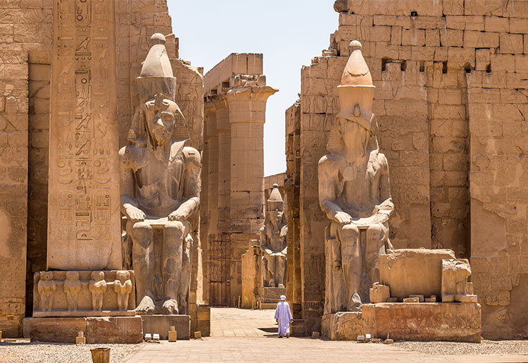 Today, its ruins lie within the modern Egyptian city of Luxor. Many well-preserved structures continue to attract numerous tourists, including the Karnak Temple Complex (the main place of worship during the 18th dynasty), Hatshepsut‘s mortuary temple, Luxor Temple (connected to Karnak Temple by the Avenue of Sphinxes), Ramesseum (a memorial temple to Ramses II) and the Colossi of Memnon (two monumental statues of pharaoh Amenhotep III). Many of these sites have been renowned tourist attractions since ancient Roman times.