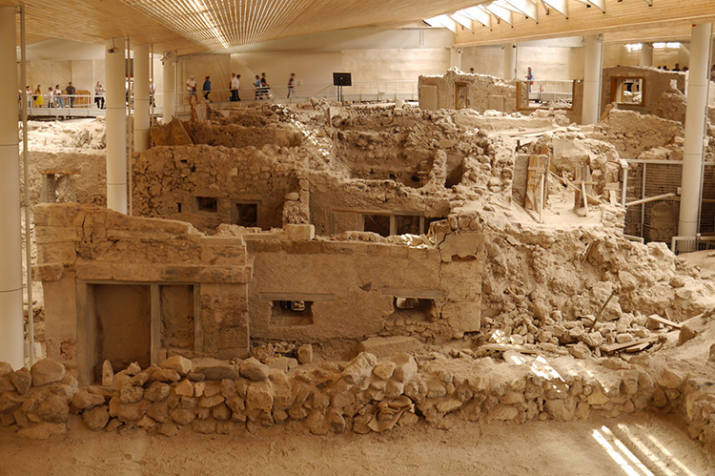 The stunning ruins of Akrotiri now stand testament to the sophisticated urban settlement which once existed there. The buildings are largely multi-storey, with many of them containing vivid frescoes on various themes. This excellent state of preservation has drawn parallels with another famously volcanically preserved site, earning it the moniker of the “Minoan Pompeii“.