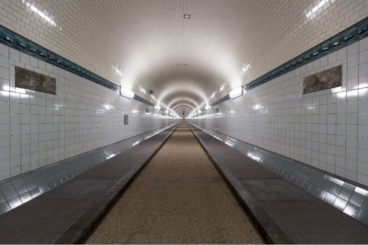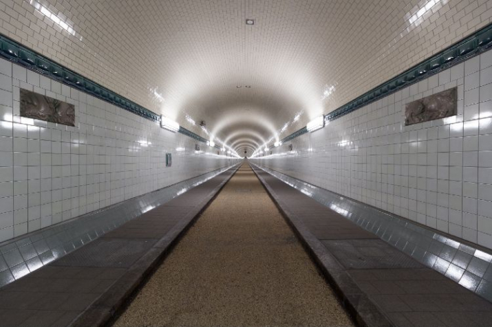 Built 24 metres beneath the surface, its two 6 metre-diameter tubes connect central Hamburg from the Landungsbrücken piers in St. Pauli (which house the machinery) with the docks and shipyards on the southern banks of the River Elbe at Steinwerder.