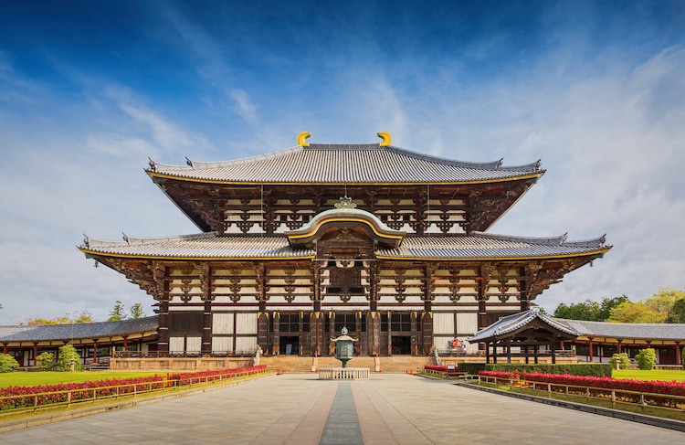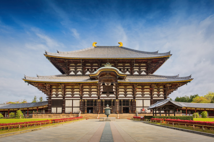 The largest wooden building in the world, the temple of Todai-ji, or ‘Great Eastern Temple’, is the Japanese headquarters of the Kegon school of Buddhism. Located in the capital Nara, the main buildings of the Todai-ji temple complex were constructed between 745 and 752 BC under Emperor Shōmu, a devout Buddhist, marking the adoption of Buddhism as state religion.