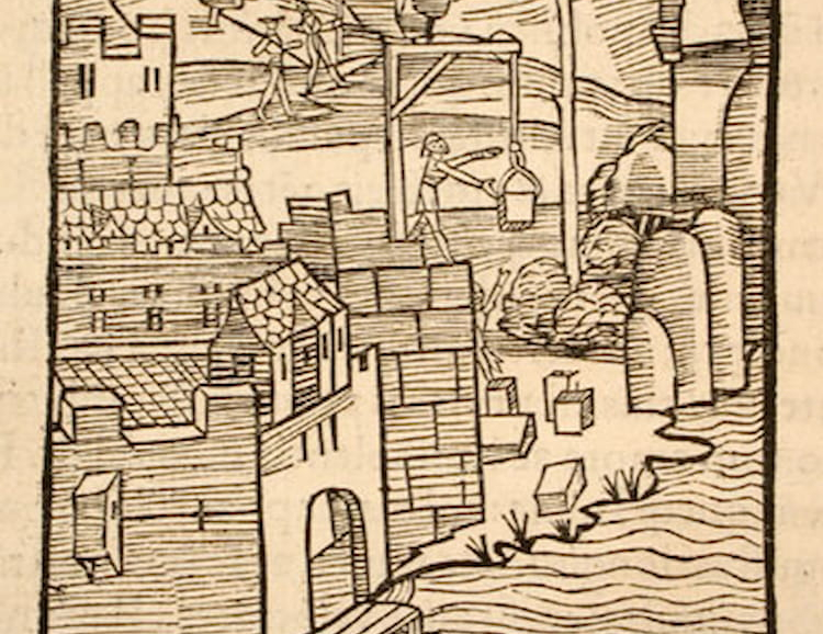 Woodcut depicting the construction of the fort of La Navidad in Hispaniola by the crew of Columbus, 1494.