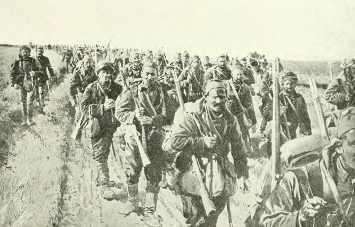 ‘Serbian Troops Marching Through the Countryside’ (Everett Marshall, 1914).