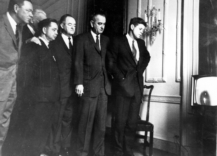 L-R: Prime Minister of Greece Konstantine Karamanlis, John F. Kennedy and Lyndon B. Johnson. 20 April 1961.