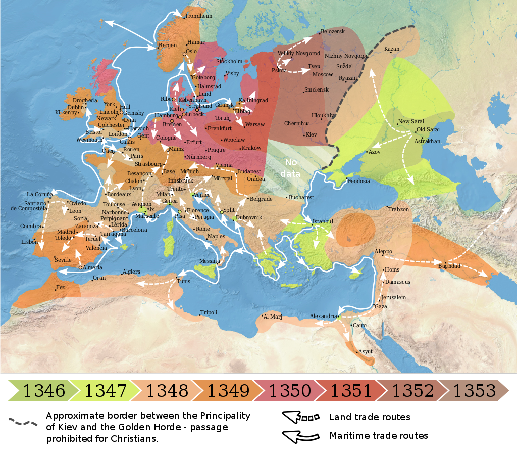 This map shows the spread of the Black Death across Europe, Western Asia and North Africa in the late 14th century.