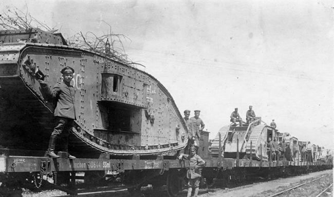 British tanks captured by the Germans being transported by rail in 1917.