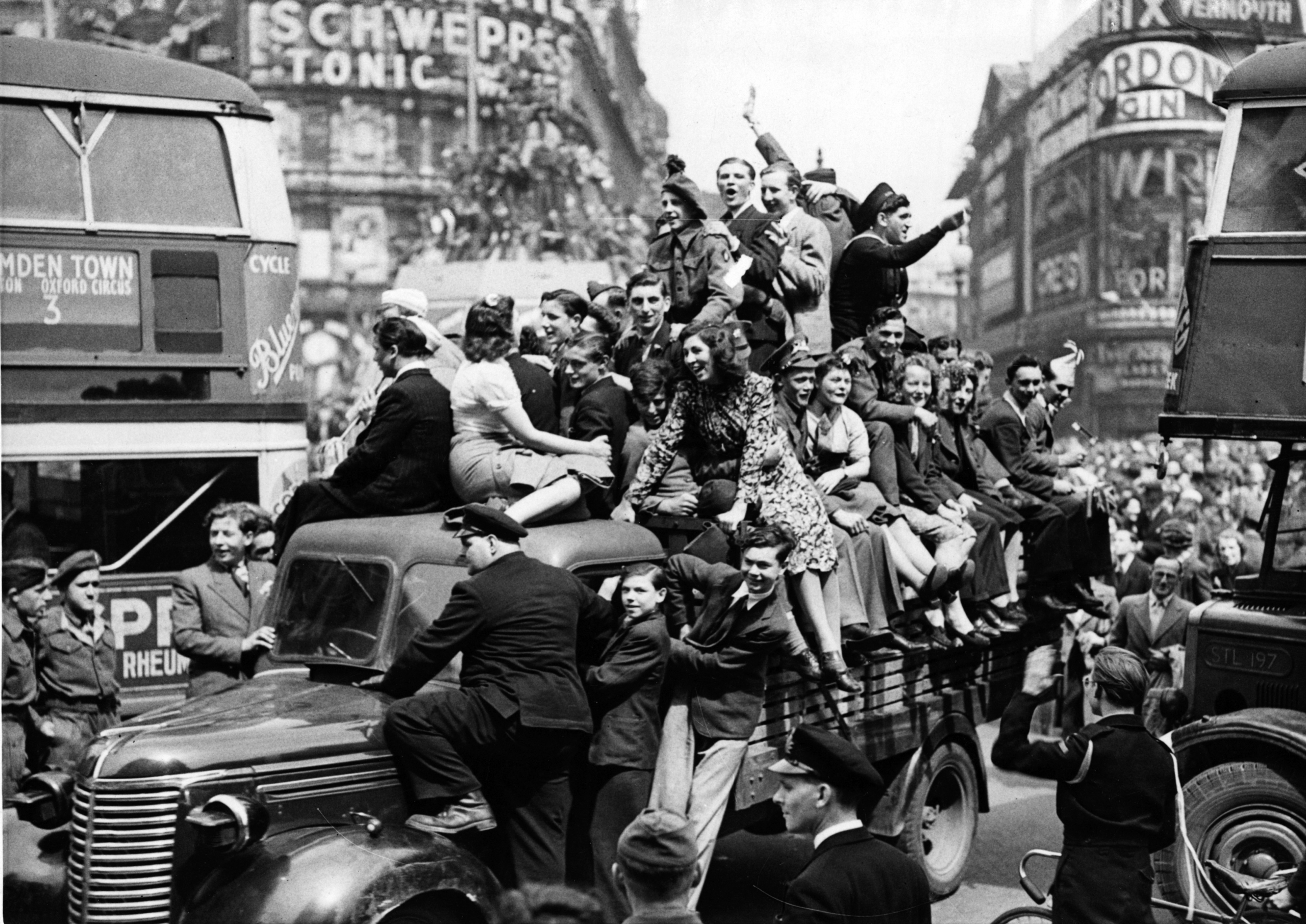 The suffering had been long. The end of the war in Europe was almost unbelievable when it came. Churchill announced on the radio at 3pm on 8 May that ‘we may allow ourselves a brief period of rejoicing’ – for the war in Japan was still continuing. People across Britain poured into the streets for impromptu celebrations and children celebrated at tea parties. Here is a street party on Prospect Hill in Leicester, 8 May 1945 and jubilant nurses celebrating on the day in Liverpool.