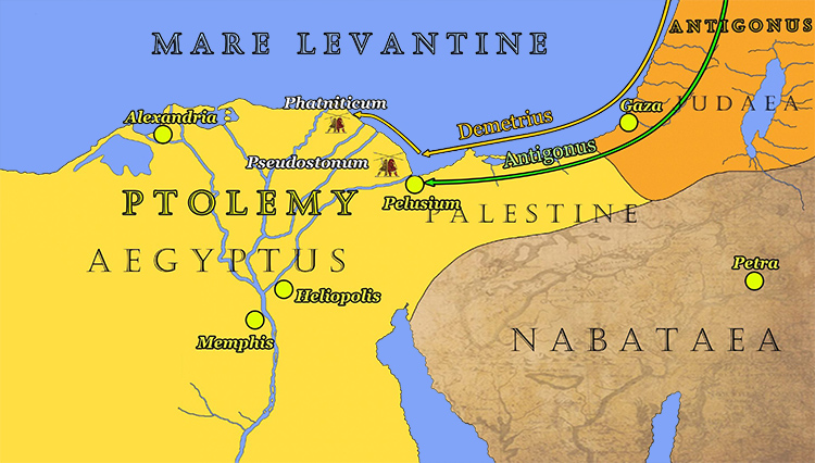 Upon reaching Pelusium, Antigonus ordered Demetrius to attempt an amphibious landing on the nearby coast, thereby creating a bridgehead for his forces. First at Pseudostonum and then at Phatniticum, Demetrius attempted to breach Ptolemy’s defences, but to no avail. Ptolemy’s defenders resisted formidably, and Demetrius was forced to return to his father.