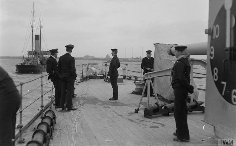 Royal Navy fleet at Libau (Liepaja). Light cruiser HMS CASSANDRA on left, 1918 (Credit: Imperial War Museums).