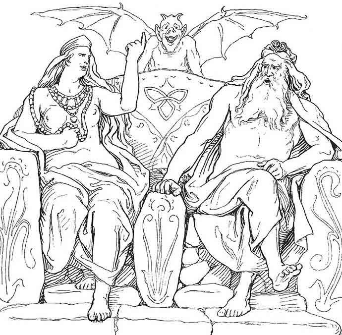 A 19th century illustration of Frige and one of her handmaidens.