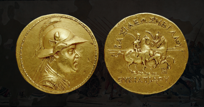 The writing on the coin reads basileus megalou eucratidou (BAΣIΛEΩΣ MEΓAΛOY EYKPATIΔOY ): ‘of Great King Eucratides’.