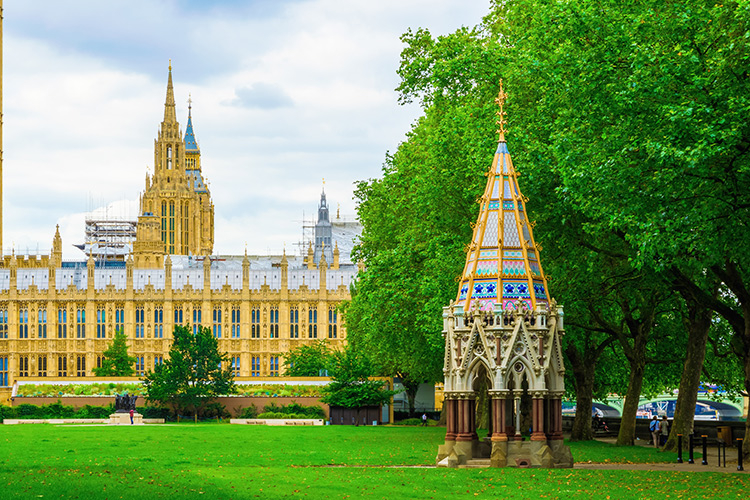 Buxton Memorial Fountain stands in Victoria Tower Gardens, located along the Thames River beside the Palace of Westminster. If walking from the Houses of Parliament and along the riverbank, visitors will see the fountain as roughly 200 metres from the entrance to Lambeth Bridge.