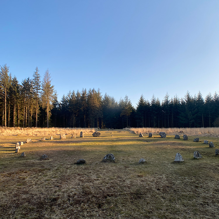 Fernworthy Forest Stone Circle, also known as Froggymead, is a Bronze Age stone circle located in central Dartmoor, Devon. Because of its mysterious appearance in a clearing of spruce trees, the stone circle is very popular – and gets some amazing evening light on a clear day.