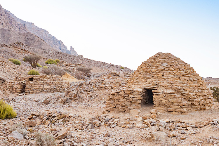 The Jabel Hafit Tombs belong to the ‘Hafeet Period’ which was about 3200 to 2700 BC and named for the distinctive beehive shaped tombs. There are approximately 500 tombs in all at the foot of the mountain, discovered in 1950 and excavated by Danish archaeologists in 1959. There are rare skeletal remains in the tombs, but workers presume as many as 10 individuals were originally buried in any particular tomb.