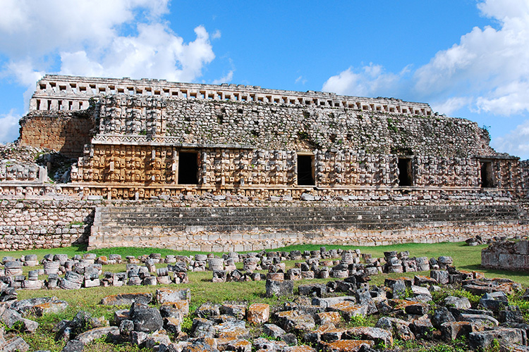 One of Kabah’s most impressive sites is El Palacio de los Mascarones (Temple/Palace of the Masks), so called for its many depictions of the rain god, Chaac: there are nearly 300 of them on the palace façade.