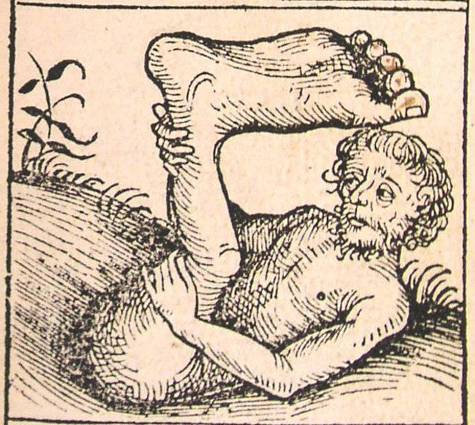 “…live in Ethiopia; they have only one leg, and are wonderfully speedy. The Greeks call them σκιαπόδεϛ (“shade-footed ones”) because when it is hot they lie on their backs on the ground and are shaded by the great size of their feet.”