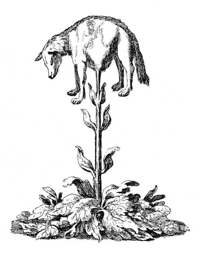 The Origins of the Vegetable Lamb are unclear although both Jewish and Celtic folkloric traditions feature similar plant-animals. The Vegetable Lamb was believed to be attached to the plant by its umbilical cord and to graze the area accessible around the plant. The legend became popular in England in the 14th century thanks to the travel writing of John Mandeville.