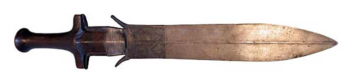 These sharp little weapons were typically between 7 and 11 inches long and about 2 inches wide and are believed to be descended from Spanish models. The blade had a central rib and a handle was riveted on (although these rivets vanished from the 1st century AD, and many later examples are found with replacement handles).