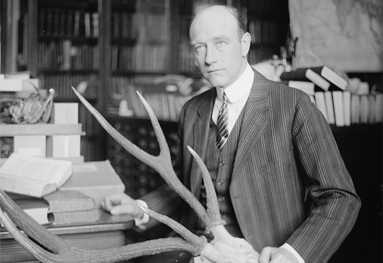 Explorer Roy Chapman Andrews holding the skull of a deer