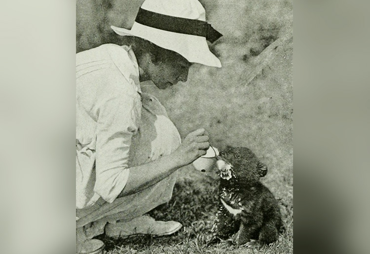 Mrs. Yvette Borup Andrews, first wife of Roy Chapman Andrews, feeding Tibetan Bear cub in 1917