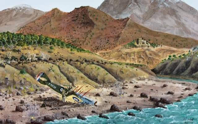 Sgt Macro, who had had RAF experience, realising that the wrecked plane would contain probably more than 1000 rounds of ammunition, possibly bombs and machine guns which would be of great value to the tribesmen, volunteered to go down to the wrecked plane, which was lying at the bottom of a dry river bed, to see what could be salvaged.