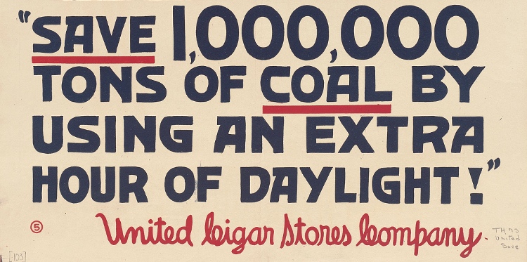 Extract of a poster issued by the United Cigar Stores Company in the United States to promote daylight saving time in 1918 during World War One. The poster reads: “Saving Daylight! Set the clock ahead one hour and win the war! Save 1,000,000 tons of coal by using an extra hour of daylight!” 1918.