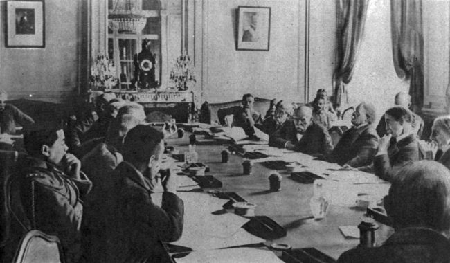 German delegates in Versailles: Professor Walther Schücking, Reichspostminister Johannes Giesberts, Justice Minister Otto Landsberg, Foreign Minister Ulrich Graf von Brockdorff-Rantzau, Prussian State President Robert Leinert, and financial advisor Carl Melchior. (Image Credit: Bundesarchiv, Bild 183-R01213 / CC).