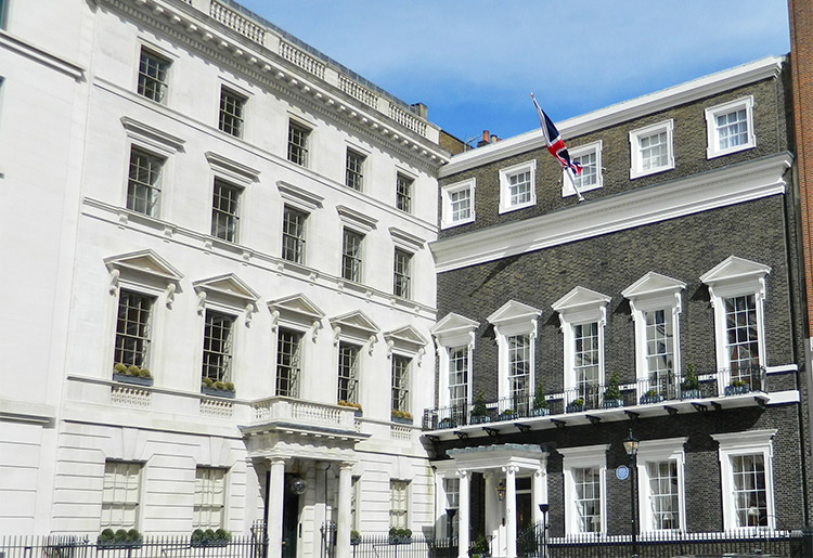 Former Libyan People’s Bureau, 5, St James’s Square, London. From here WPC Yvonne Fletcher was shot on 17 April 1984. The bureau was in the white building on the left of the image