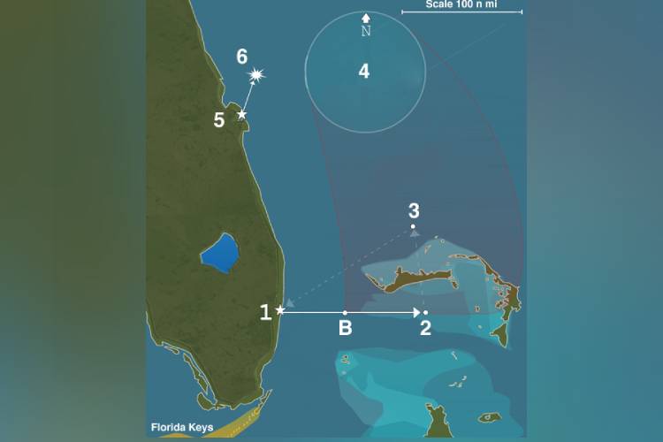 Flight 19’s scheduled navigation exercise on 5 December 1945. Numbers 1, 2, 3 are the intended route, Number 4: radio triangulation at 17:50 establishes flight’s position to within 50 nautical miles of 29°N 79°W and their last reported course, 270°. (Numbers 5 and 6 show the route of PBM Mariner who went to search for Flight 19, culminating in its explosion)