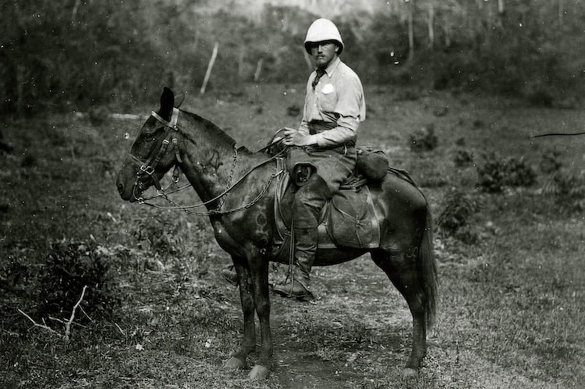 Photograph of Alfred Percival Maudslay on a mule in Quiriguá, Guatemala, c. 1890.