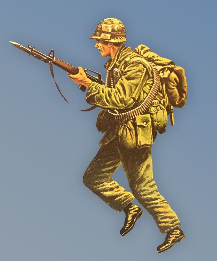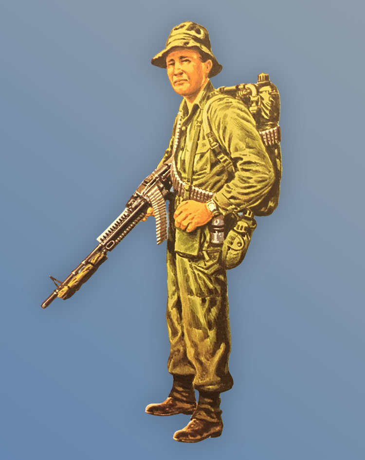 This private in the US Marine Corps during the battle for Hue, February 1968, wears standard olive-drab combat dress and a flak jacket. The bayonet on his M16A1 5.56mm rifle is fixed for house-to-house fighting, and slung around his body is a belt of 7.62mm ammunition for his squad’s M60 light machine gun. His pack contains spare clothing and equipment.