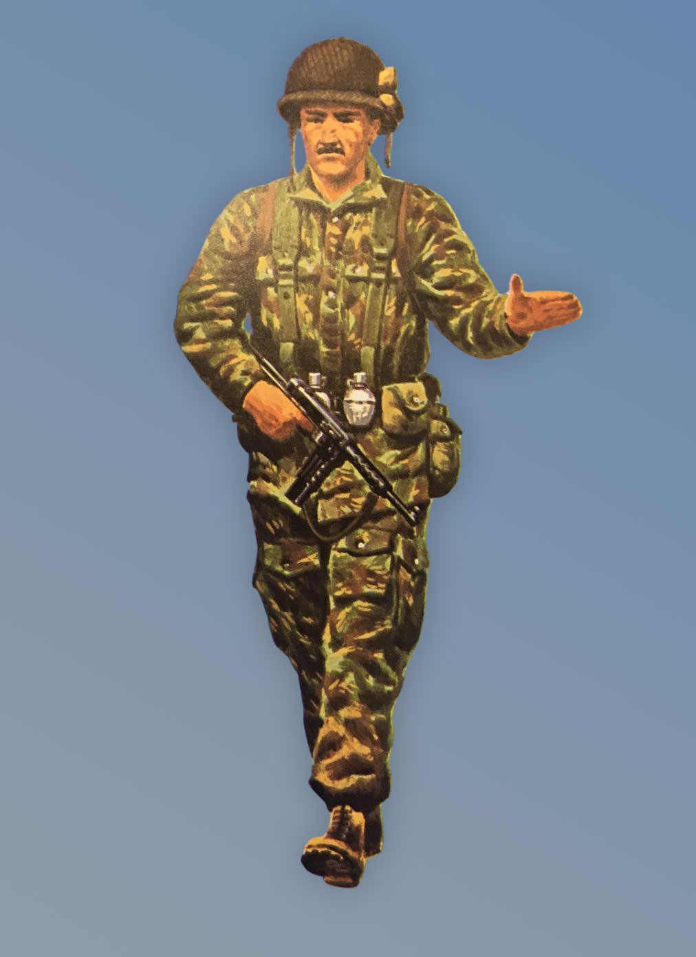 This Australian infantryman carries his squad’s 7.62mm light machine gun and two spare ammunition belts. The weight of his web equipment is taken by the belt; the front of his body is clear so that he can lie comfortably in the prone firing position. The Australians were heirs to two generations of jungle warfare, and this experience is shown by his extra waterbottles, the value of which more than offsetting the extra weight involved.