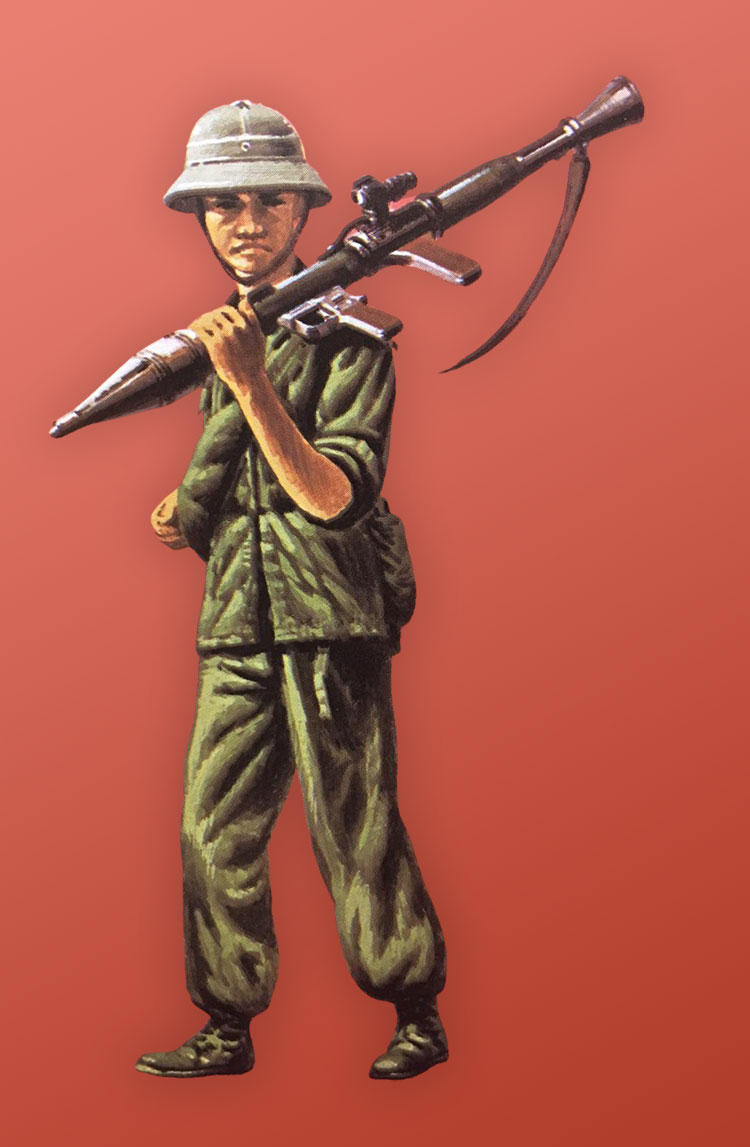This soldier of the North Vietnamese Army wears a green uniform and a cool, practical helmet resembling the pith helmet of earlier European colonizers. The basic personal weapon of the NVA was the AK-47, but this man carries a Soviet-supplied RPG-7 anti-tank missile launcher. His food-tube contains sufficient dry rations and rice to last seven days.