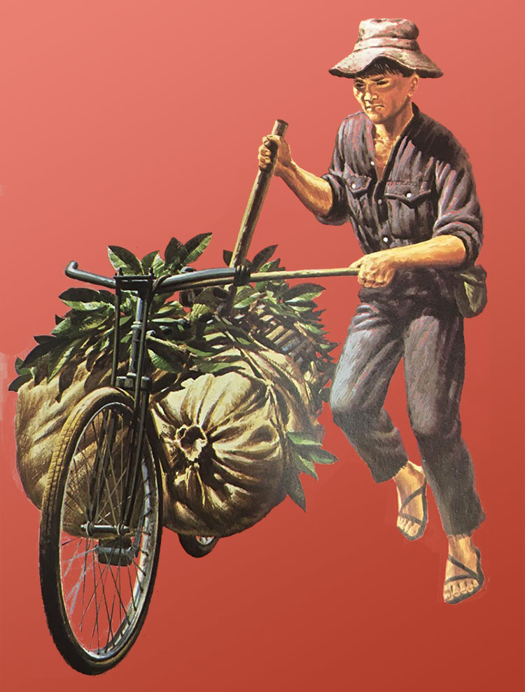 This Communist porter can carry some 551b (25kg) on his back for an average 15 miles (24km) per day in flat country or 9 miles (14.5km) in hills. With the modified bicycle seen here the payload is some 150lb (68kg). The bamboos attached to handlebar and seat column enable him to control his machine even on rough ground.