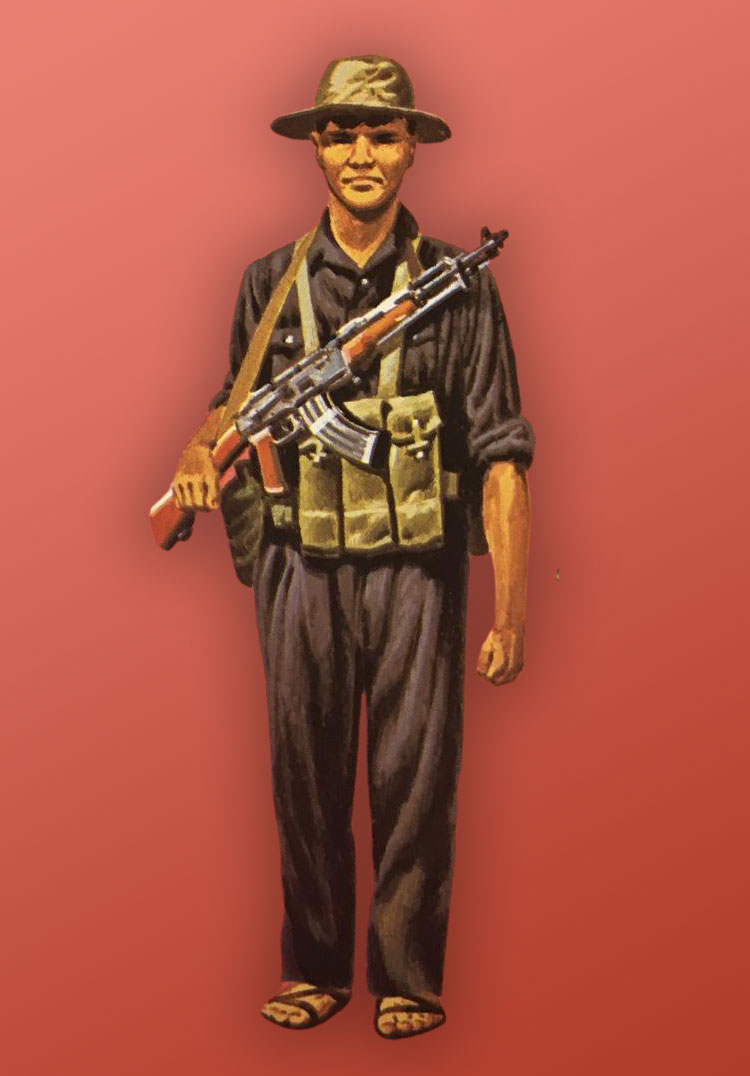 This Viet Cong soldier wears the “black pyjamas”, which have come to characterize the guerrilla fighter, and a soft khaki hat and web equipment produced in jungle workshops. His light, open sandals are probably cut from an old truck tire. He carries a Soviet Kalashnikov AK-47 rifle.