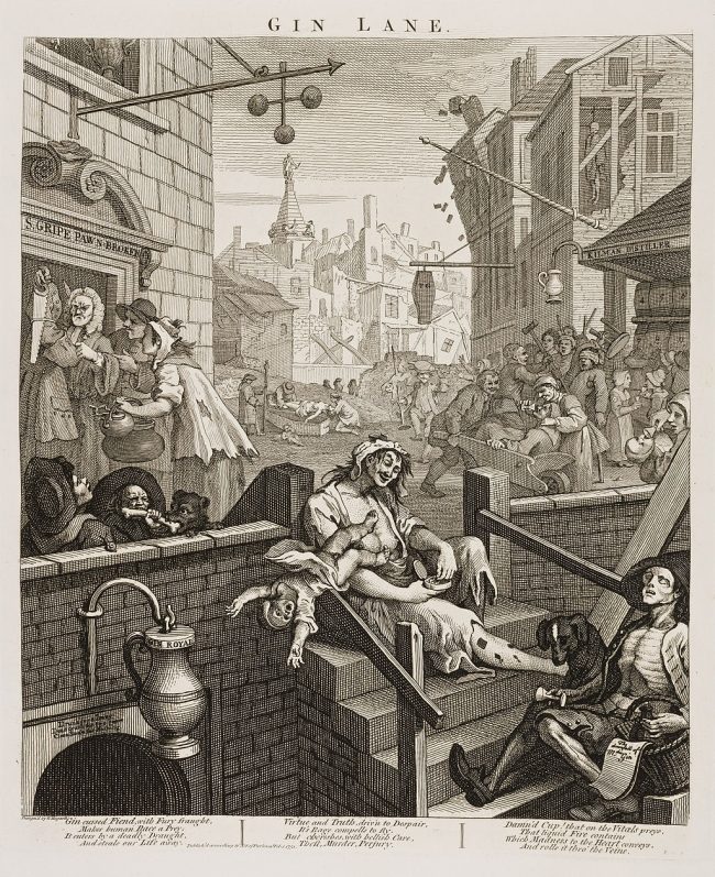 In the first half of the 18th century, London slums were rife with an epidemic of drunkenness. With over 7,000 gin shops by 1730, gin was available to buy at every street corner.