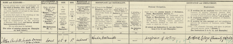 Dame Helen Gwynne-Vaughan listed on the 1921 Census as ‘Professor of Botany’ at Birkbeck College.