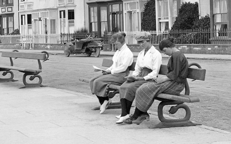Women sitting on a bench reading.