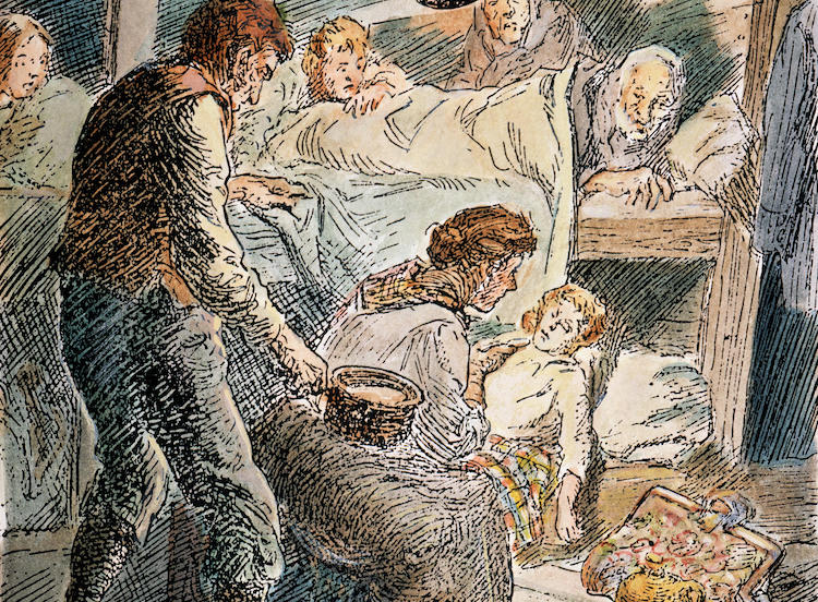 British emigrants aboard a ship to Canada, seeking to escape the post-Napoleonic depression. Color illustration by Charles W. Jefferys.